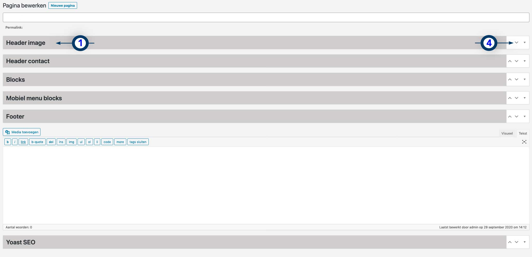 Indien er op een pagina/bericht extra invoervelden voor tekst aanwezig zijn, kijk dan goed naar de titel (1) (zie ook afbeelding hieronder). Met het pijltje naar beneden kun je het invoerveld zichtbaar maken (4, afbeelding hieronder). Vervolgens kun je de tekst invoeren of wijzigen in het tekstvlak (2). Het tekstinvoerveld kan verschillen: soms staan er tekstopmaak knoppen boven, in andere gevallen is er alleen een tekstvlak.