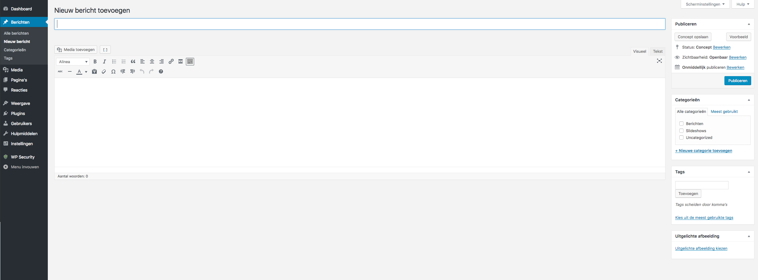 Via Berichten >> Alle berichten krijg je een overzicht van alle bestaande pagina’s. Wanneer je een nieuw bericht wilt toevoegen, klik je op Nieuw bericht.