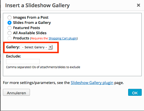 Vink Slides From a Gallery aan en selecteer vervolgens de juiste gallery. Op deze manier wordt de code van de slideshow in het bericht of pagina geplaatst.